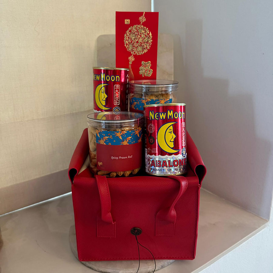 An elegant and thoughtful festive set comprising 2 bottles of handmade cookies and 2 cans of premium Australian New Moon abalone, representing fortune, harmony and blessings for the new year.